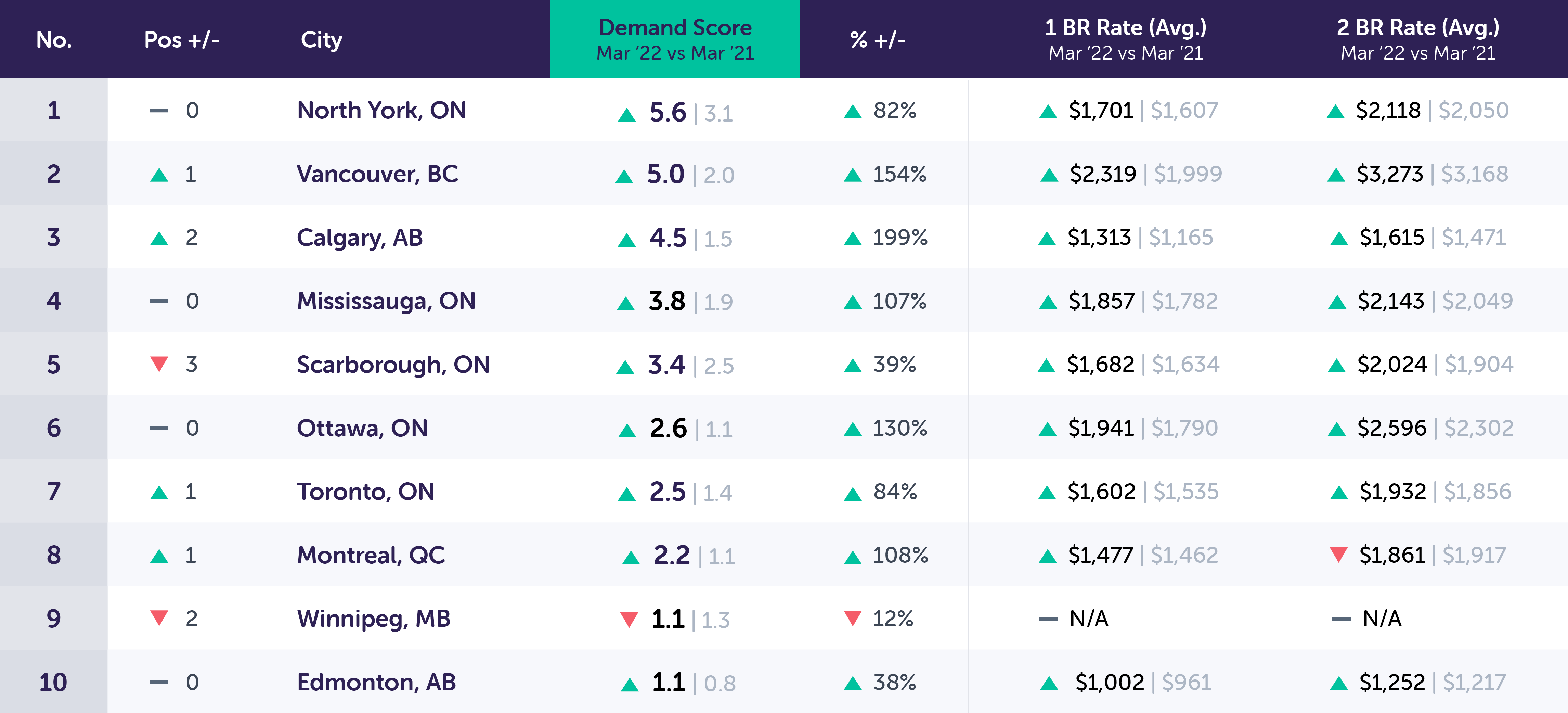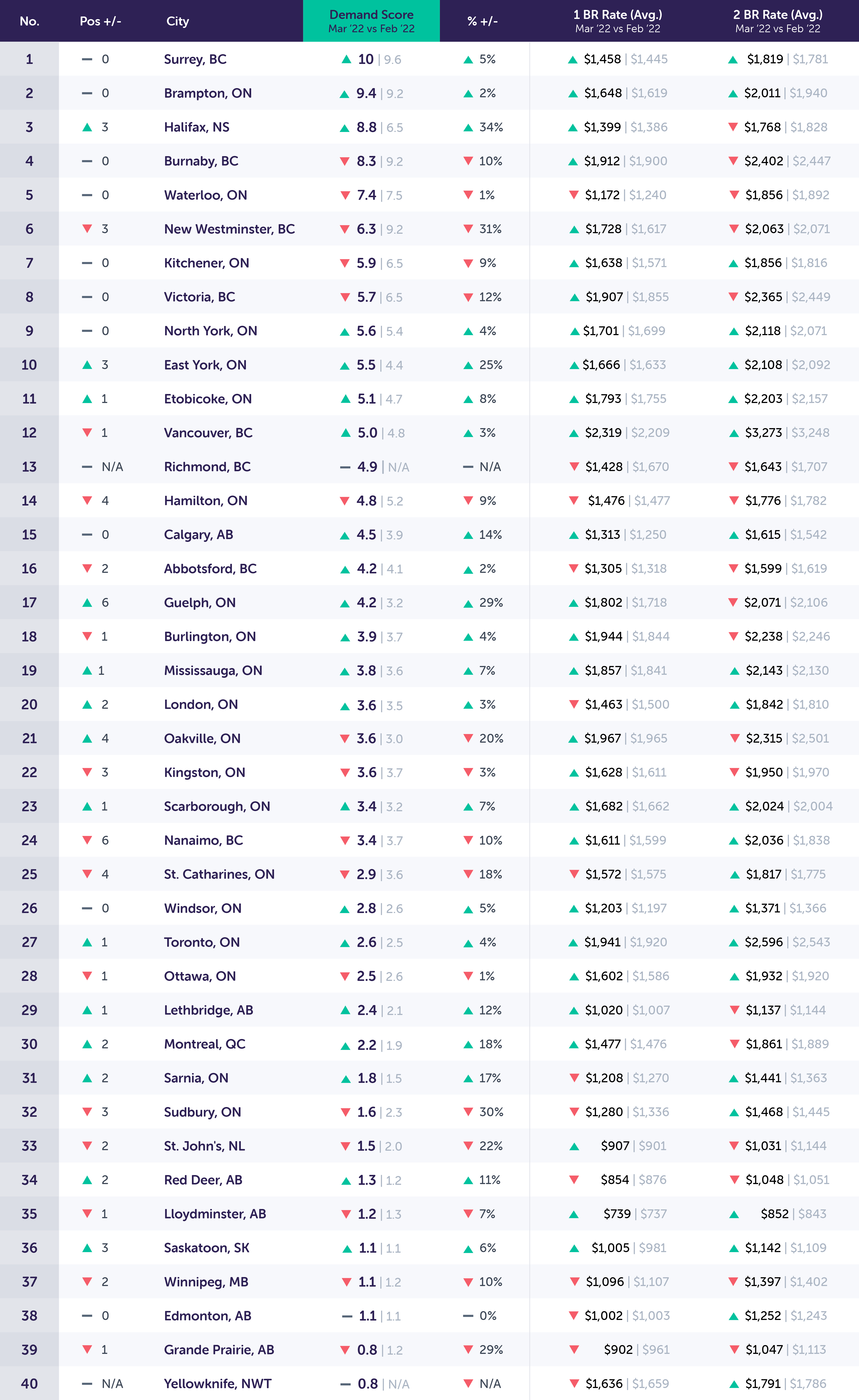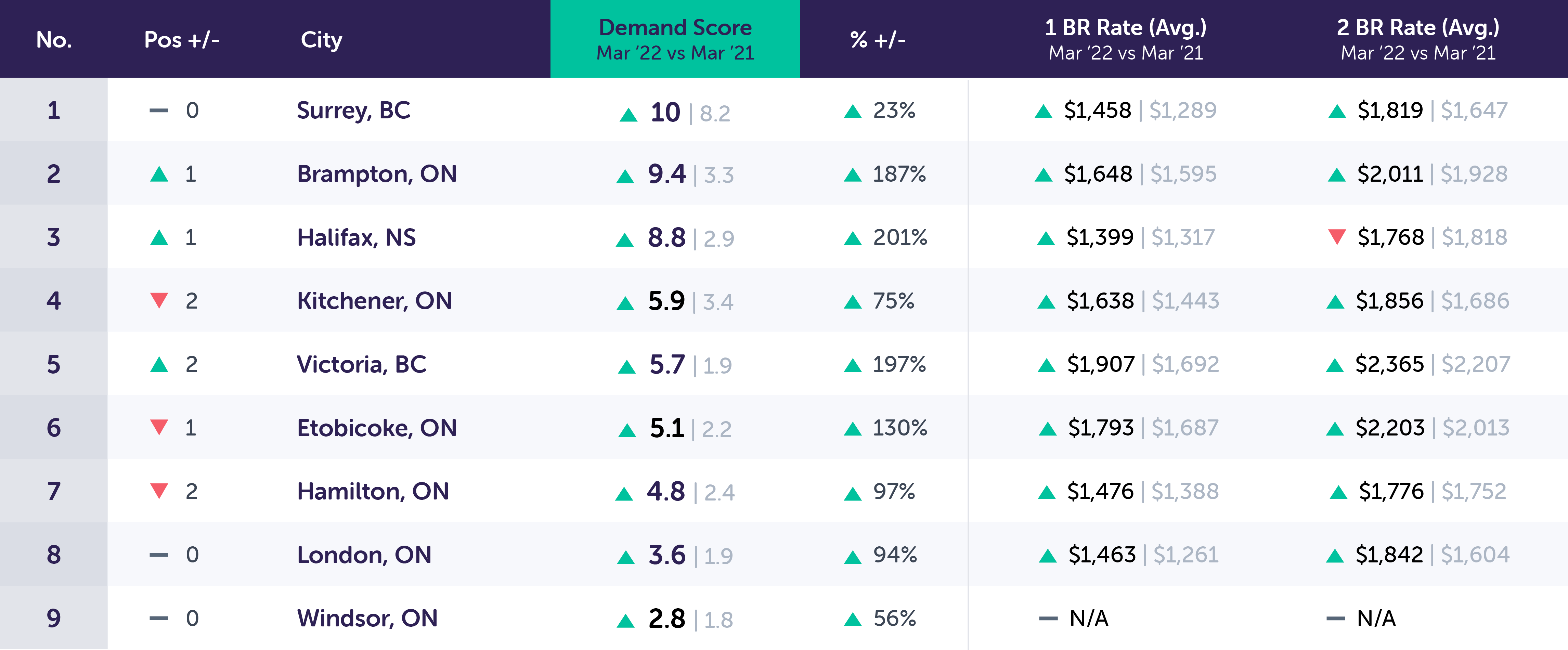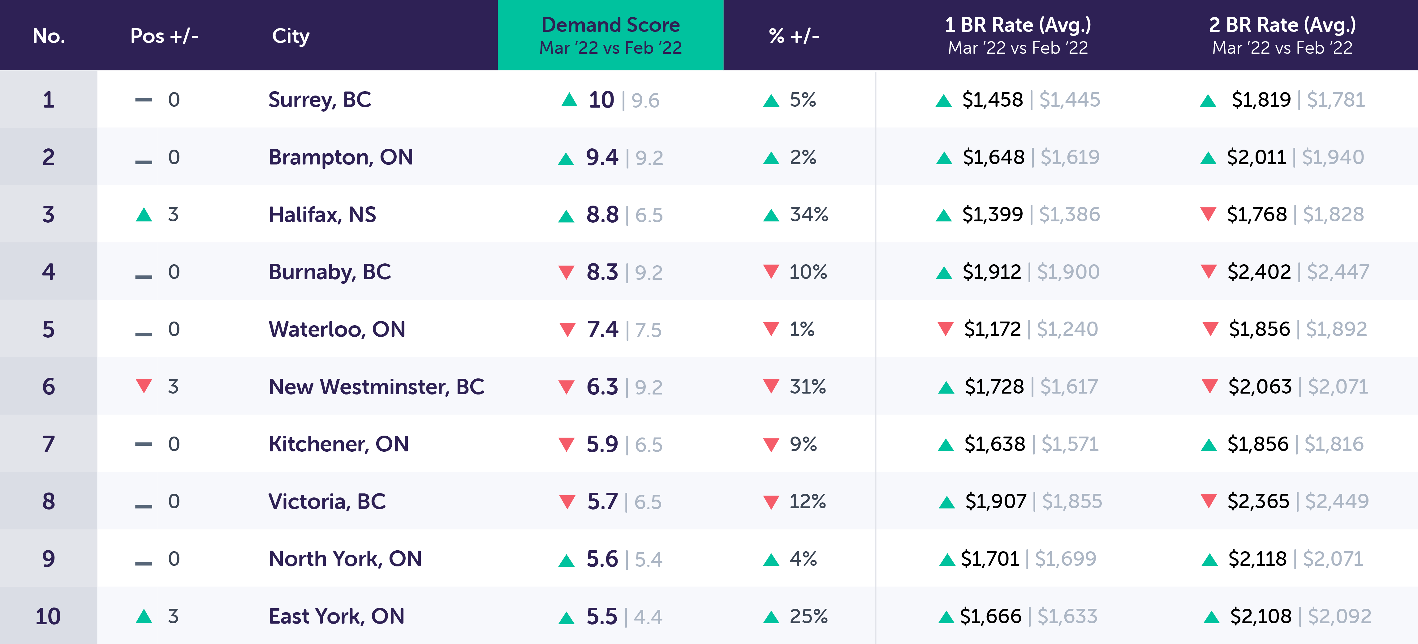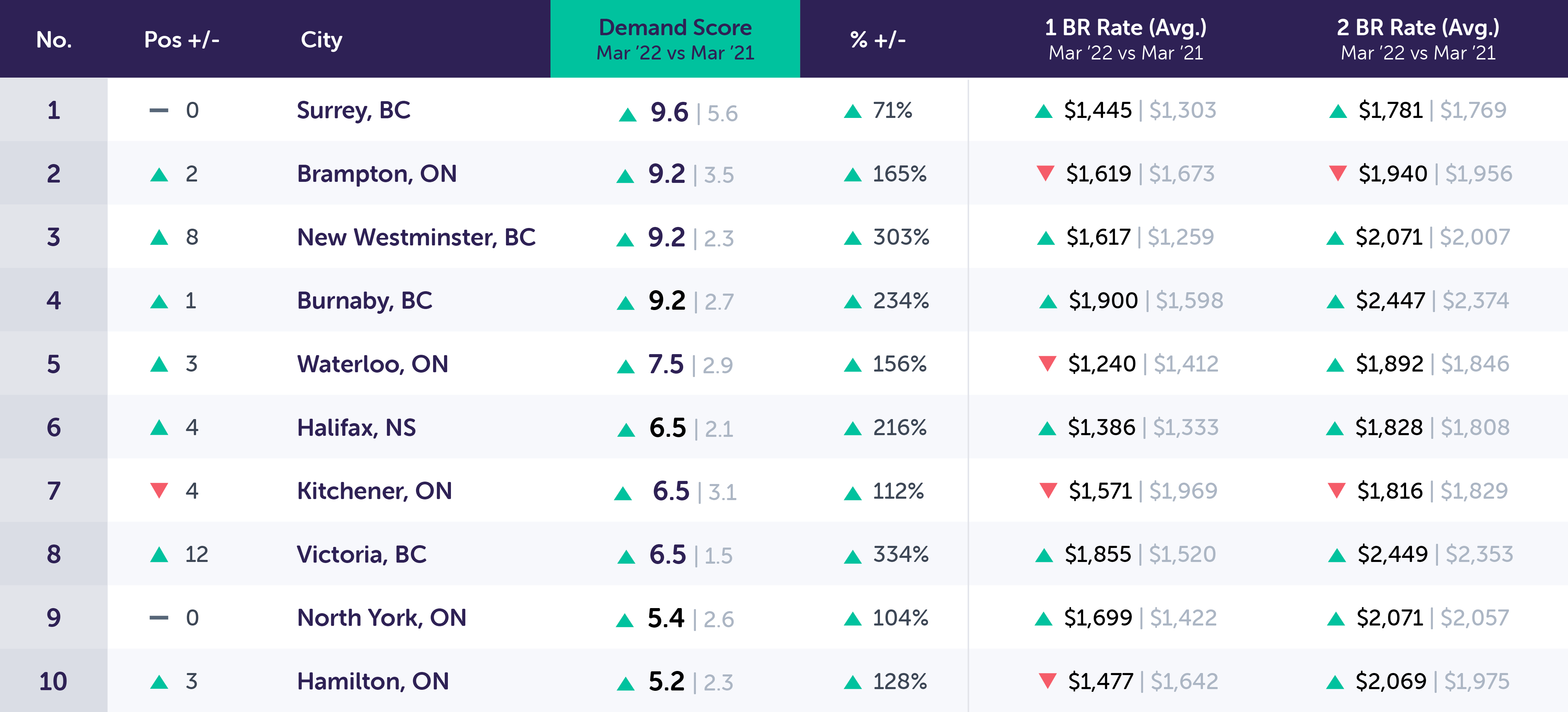 For example: The month-over-month unique leads per property in Surrey, ON went up 5% in March versus February. In March 2022, the year-over-year Demand Score in Surrey, ON went up 4.0 points based on an increase of 71% unique leads per property compared to December 2020.