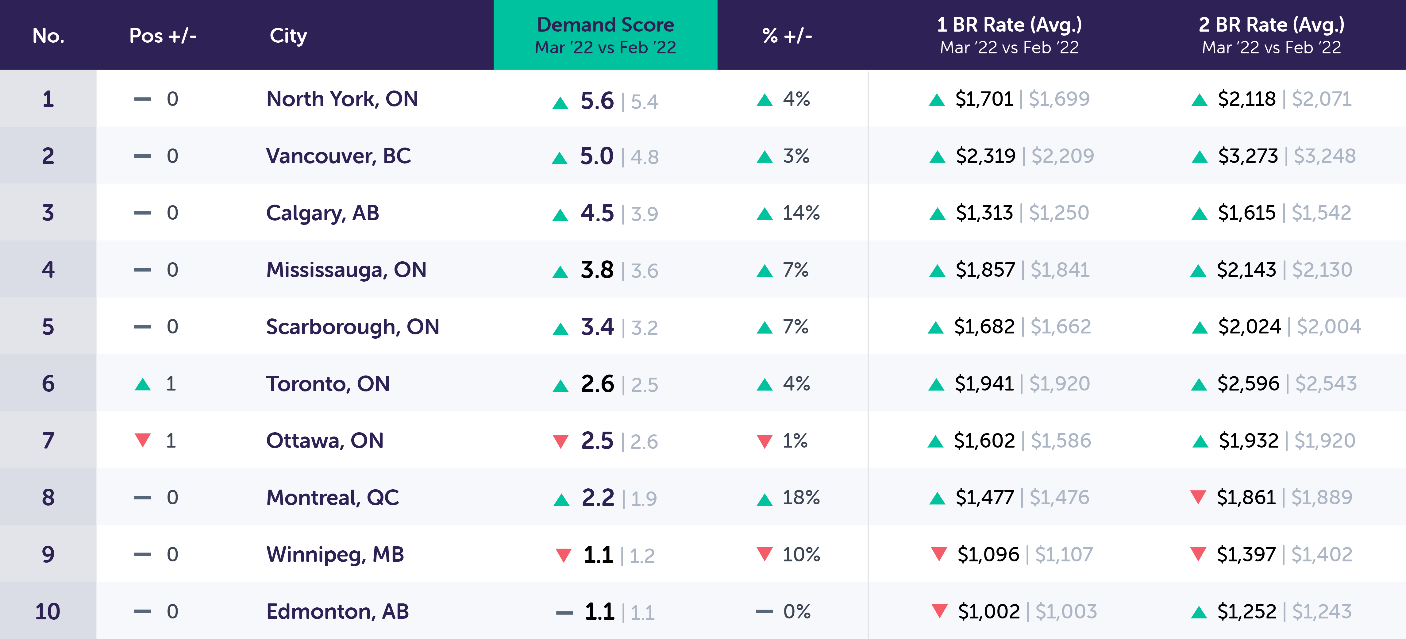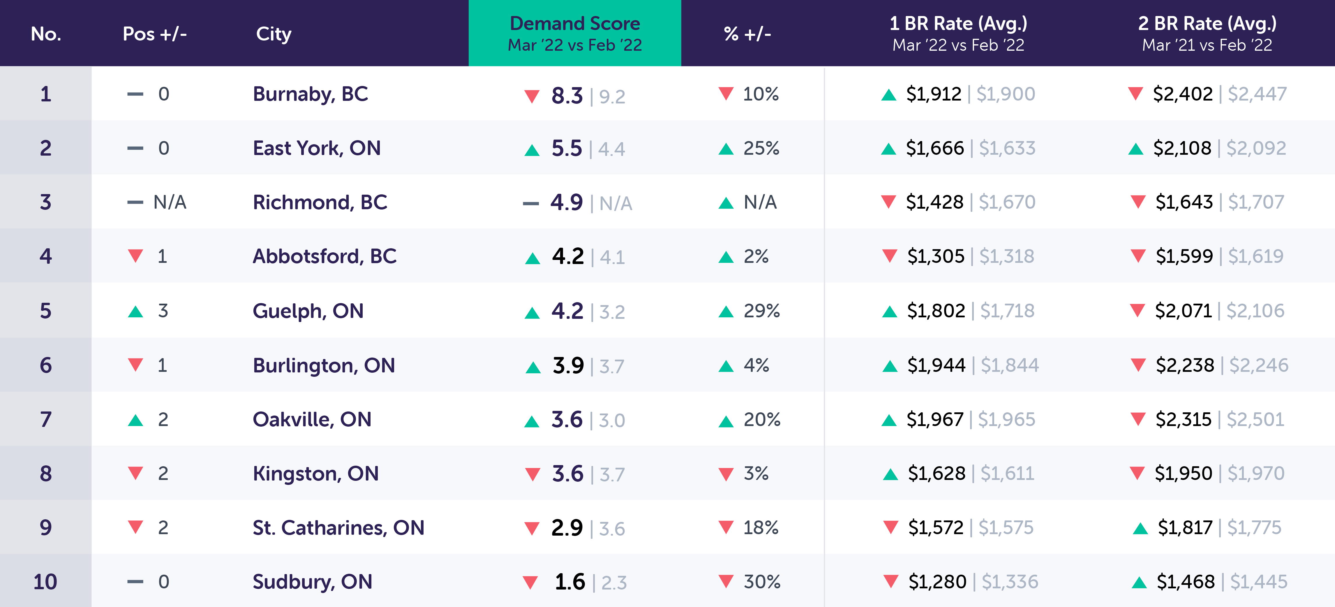 *March, although on the early end of what is considered leasing season, experienced a lift in renter traffic (Following the blip experienced in February with sluggish demand and property availability). The top 10 markets are highly reflective of what is being seen across Canada, with primary and tertiary markets growing, and secondary markets experiencing a mix of more moderate growth if not slight contraction in demand scores.