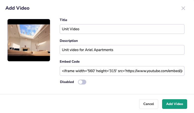 We've made it easy to add your videos and virtual tours for an entire property and its units by simply clicking add video and input the title, description and embedded code. You can also: